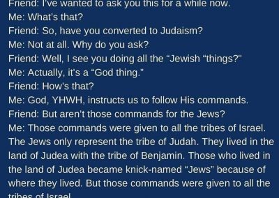Me: Oh, I have no idea about that. However, Numbers 15:14-16 says that there is one law for both the foreigner and the Israelite. That’s why Jesus, Yeshua, told his disciples to obey the law before His death in Matthew 23:1-3. Then later, in Matthew 28:19,20, Yeshua told them to make disciples of all nations, telling them to obey the same. So anyone who chooses to follow Yeshua and what His disciples taught will follow their example in pursuing the law. And the disciples gave the new Gentile converts some basics of the law to follow as they learn what Moses gave every Sabbath in Acts 15:19-21.