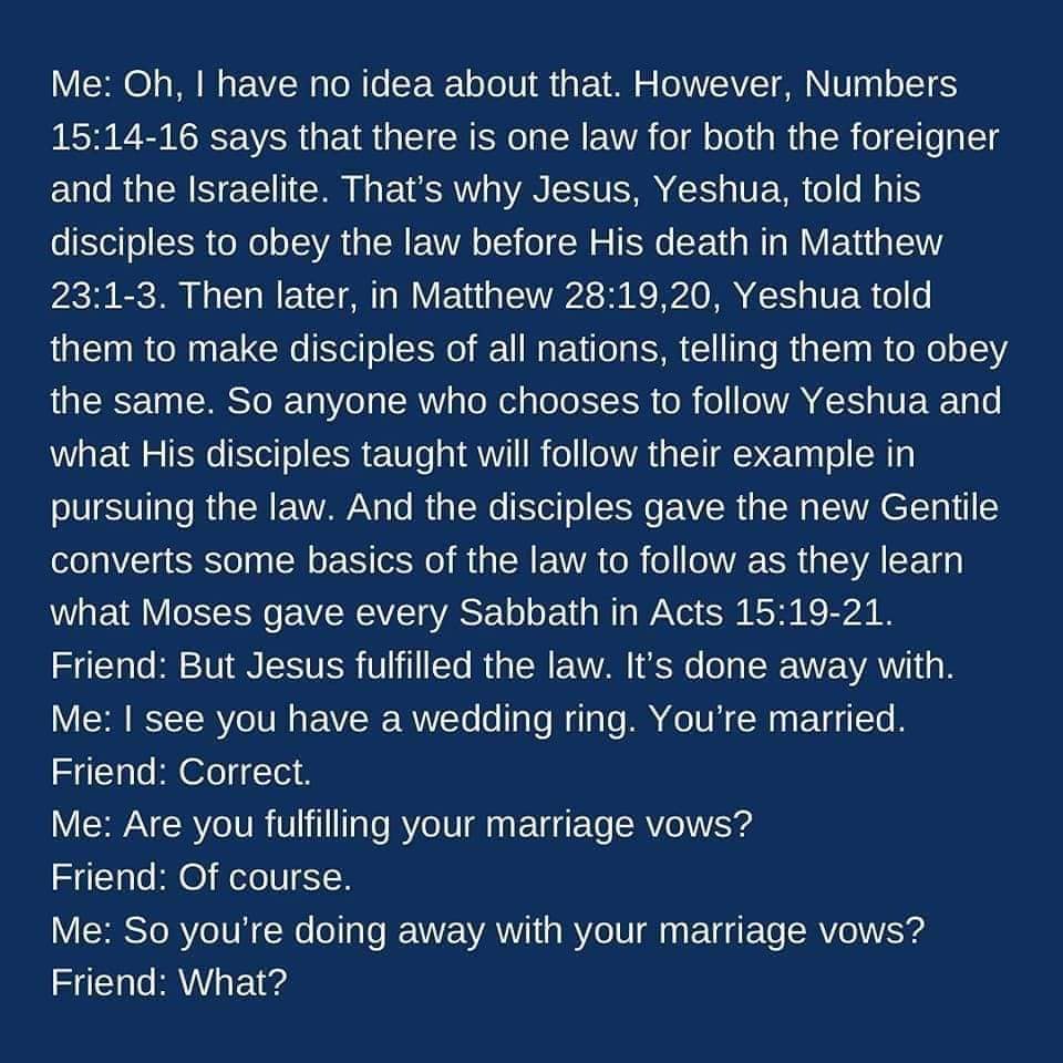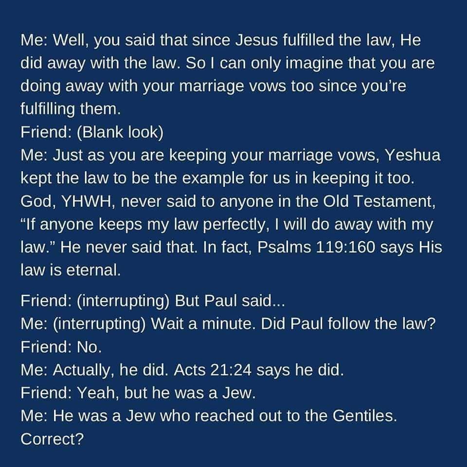 Me: Just as you are keeping your marriage vows, Yeshua kept the law to be the example for us in keeping it too. God, YHWH, never said to anyone in the Old Testament, “If anyone keeps my law perfectly, I will do away with my law.” He never said that. In fact, Psalms 119:160 says His law is eternal.