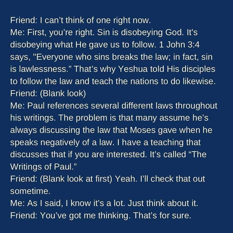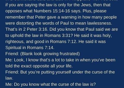 Me: And he told the Gentile converts to follow his example in 1 Corinthians 11:1 and also in Philippians 4:9. You see, if you are saying the law is only for the Jews, then that opposes what Numbers 15:14-16 says. Plus, please remember that Peter gave a warning in how many people were distorting the words of Paul to mean lawlessness. That’s in 2 Peter 3:16. Did you know that Paul said we are to uphold the law in Romans 3:31? He said it was holy, righteous, and good in Romans 7:12. He said it was Spiritual in Romans 7:14.