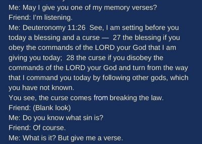 Me: Deuteronomy 11:26 See, I am setting before you today a blessing and a curse — 27 the blessing if you obey the commands of the LORD your God that I am giving you today; 28 the curse if you disobey the commands of the LORD your God and turn from the way that I command you today by following other gods, which you have not known. You see, the curse comes from breaking the law.