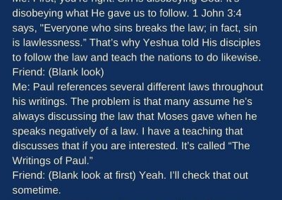 Me: First, you’re right. Sin is disobeying God. It’s disobeying what He gave us to follow. 1 John 3:4 says, “Everyone who sins breaks the law; in fact, sin is lawlessness.” That’s why Yeshua told His disciples to follow the law and teach the nations to do likewise.
